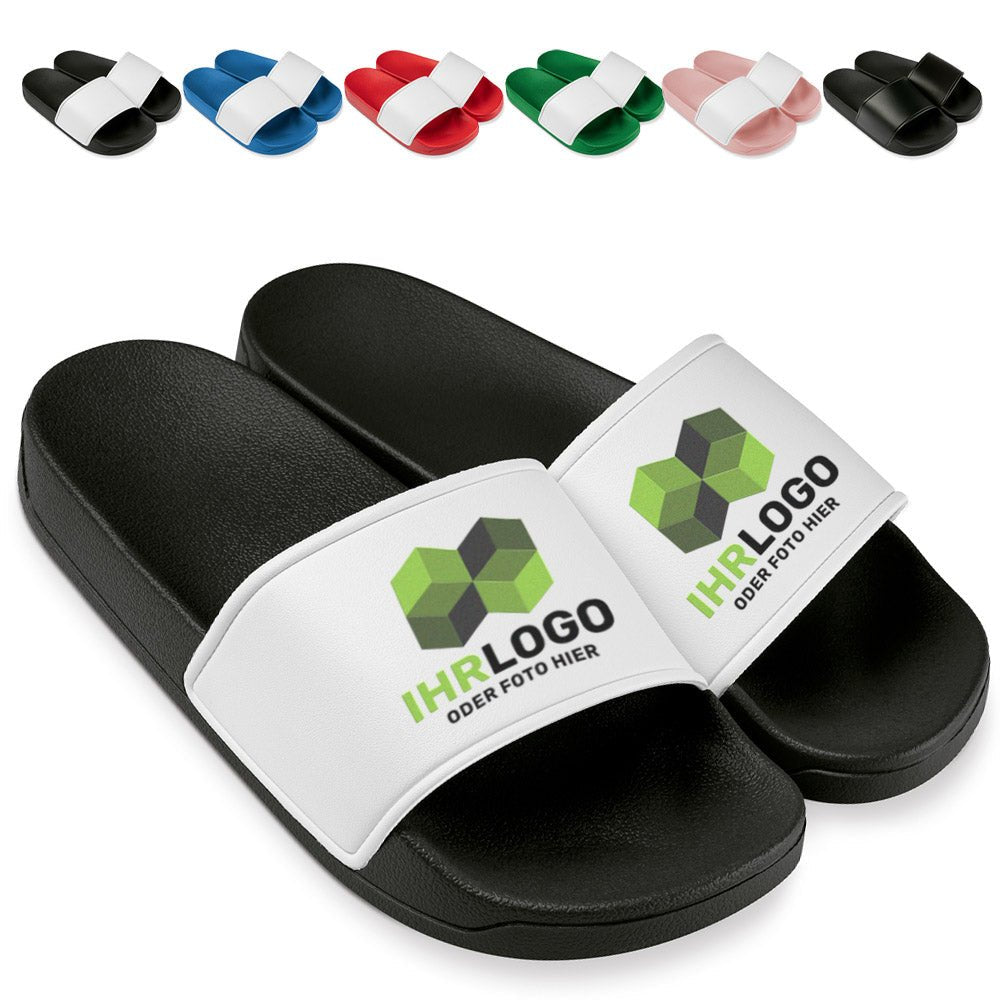 Unsere Badelatschen bedrucken und selbst gestalten bietet viele individuelle Gestaltungsmöglichkeiten. Das geformte Fußbett und die breite, stabile Lasche zum personalisieren bieten sicheren Halt. Die rutschhemmende Sohle schützt auch auf nassen Oberflächen. Ideal als Merchandising-Artikel für ihre Firma, Verein oder Geschenk.
