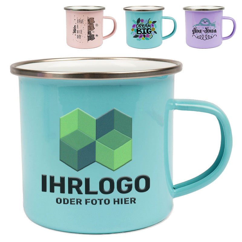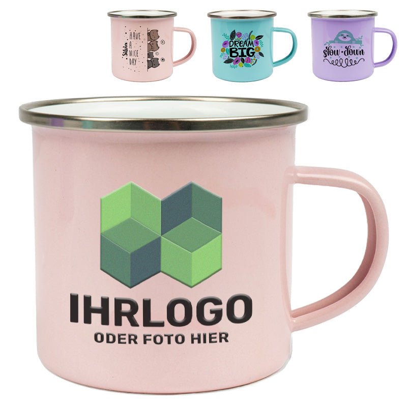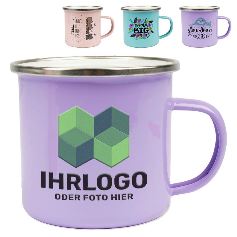 Genießen Sie Ihren Morgenkaffee in Stil mit unserer Emailletasse in attraktiven Pastellfarben! Wählen Sie aus den edlen Farbtönen Light Mint, Light Pink und Light Violett und verleihen Sie Ihrem Becher mit einem dunklen Motiv ein einzigartiges Aussehen. Der silberne Trinkrand sorgt für einen luxuriösen Touch.