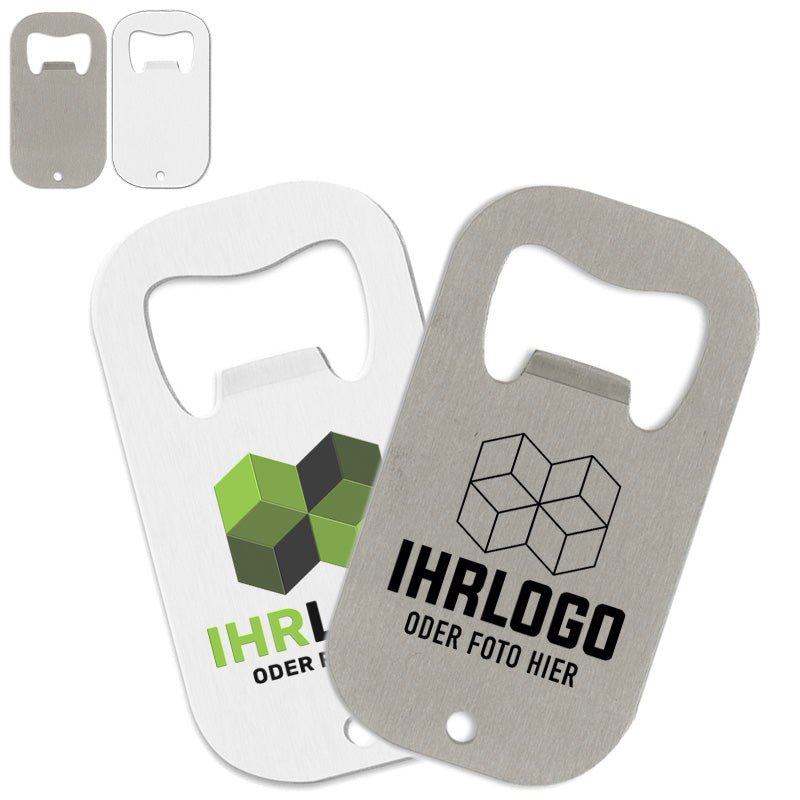 Flaschenöffner in silber. Einseitig bedruckbar mit Wunschmotiv. Randloser/ Vollflächiger Druck möglich.