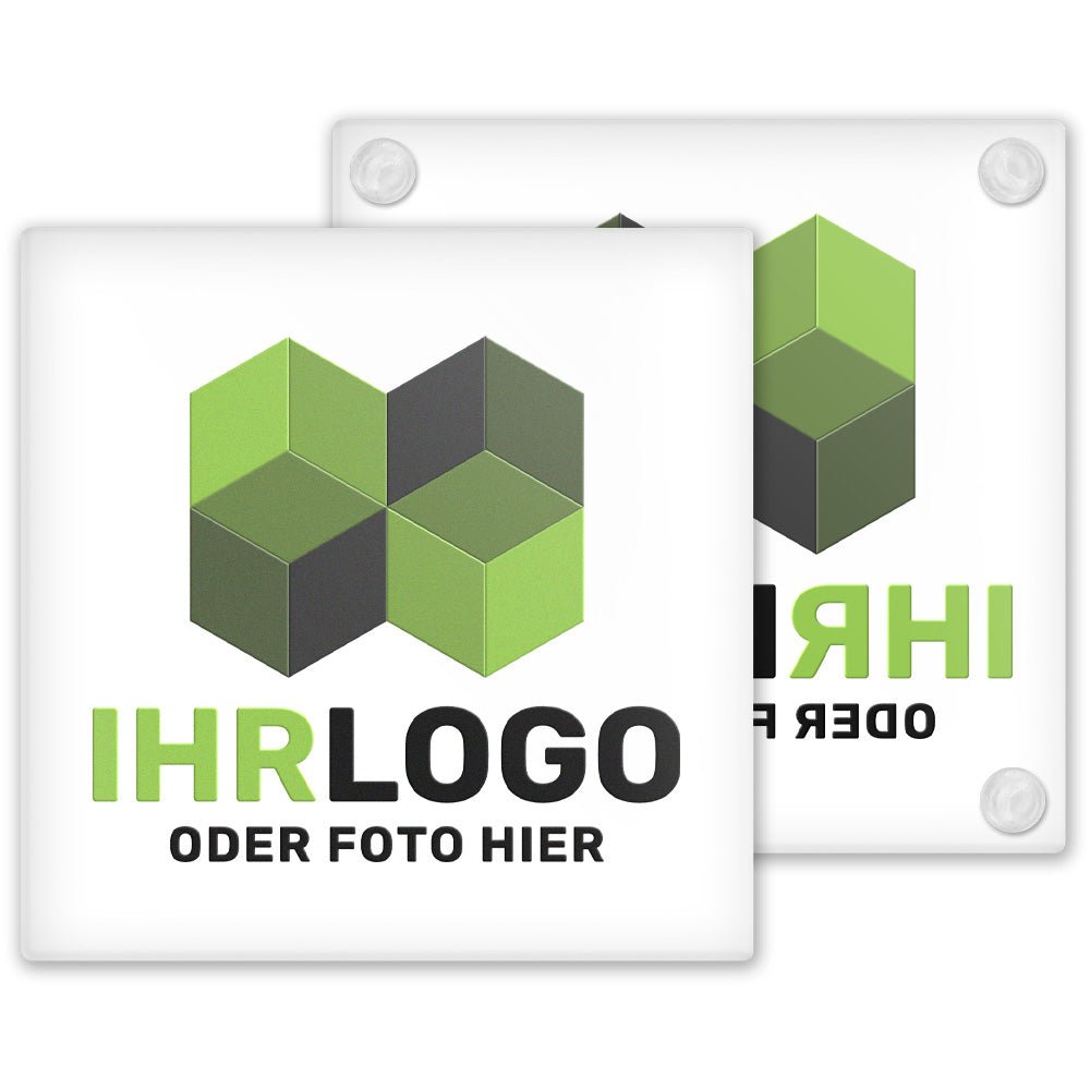 Abmessung: 10 x 10 cm | Material: Glas | Lieferung inkl. 4 Gumminoppen | Gewicht ca. 200 g | Druckfläche: Vollflächig