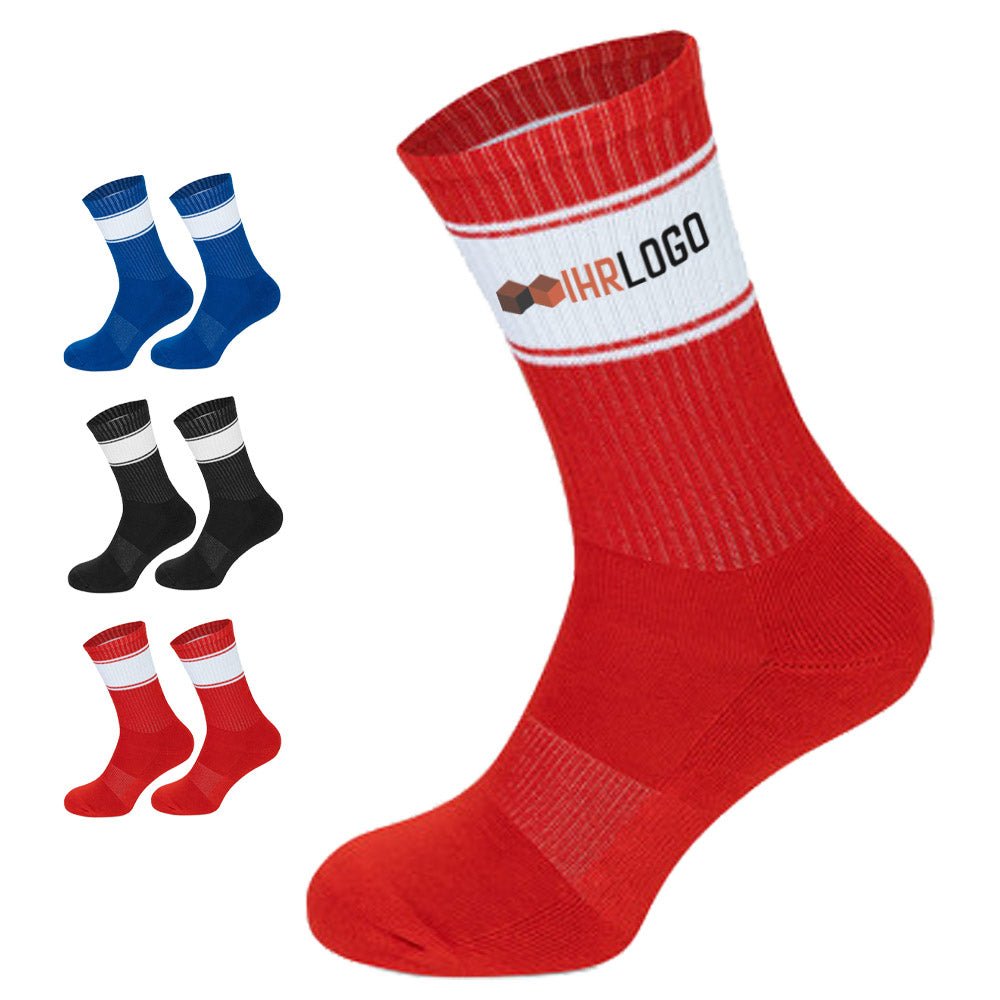 Die Mr. Socks® Tennissocken Full-Colored vereinen Komfort und Funktionalität mit lebendigen Farben. Der weiche Fußbereich aus Bio-Baumwolle garantiert ein atmungsaktives, natürliches Tragegefühl, während der elastische, gerippte Schaft auch bei intensiver Bewegung für sicheren Halt sorgt. Erhältlich in drei verschiedenen Farben. Der Weiße Bereich wird mit ihrem Logo, Wappen, Foto und Wunschtext bedruckt und personalisiert.