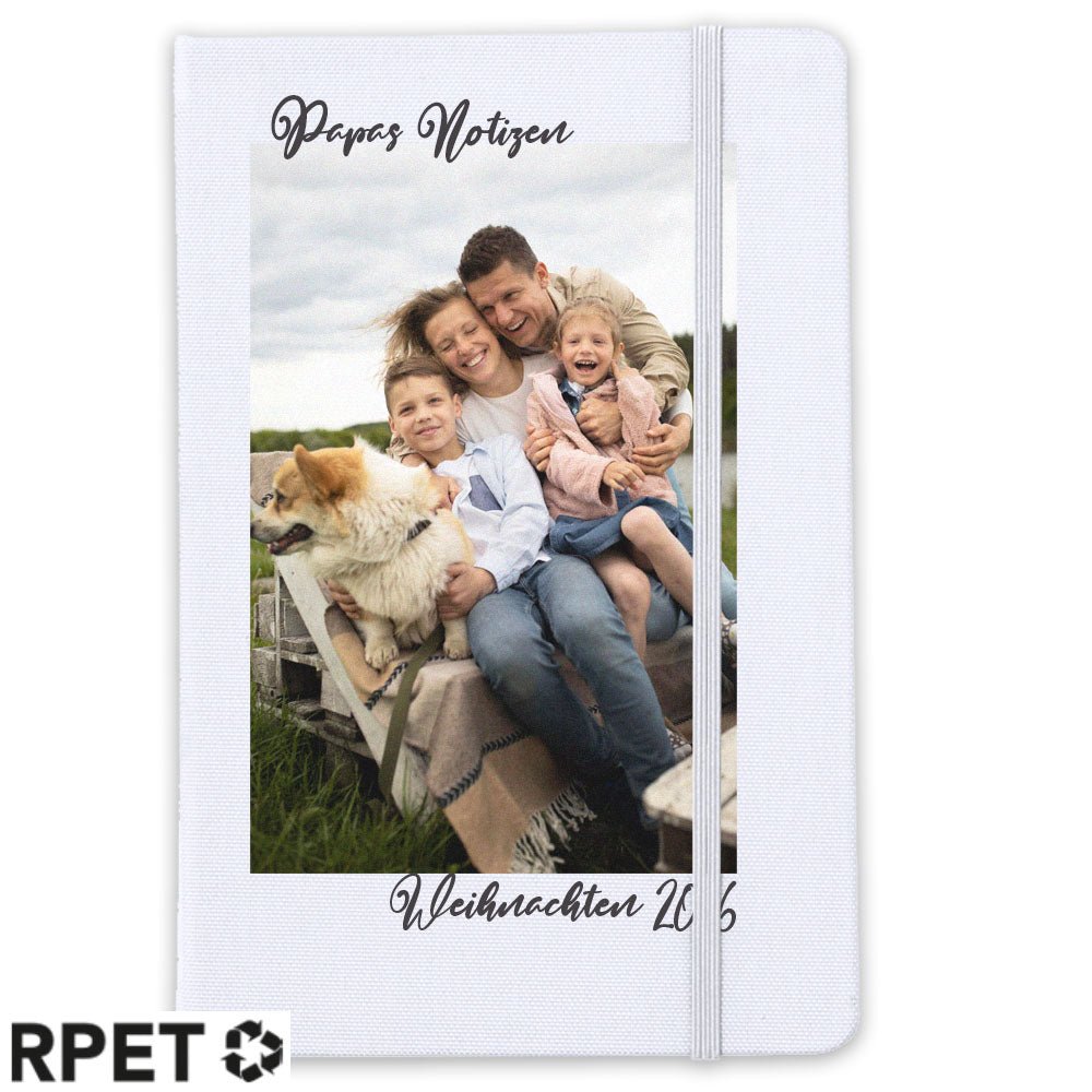 Abmessung: 14.7 x 21 x 1.5 cm | Gewicht ca. 275 gr. | Druckfläche 130 x 180 mm | Aus RPET Material | Inhalt: 100 Blatt blanko weiß