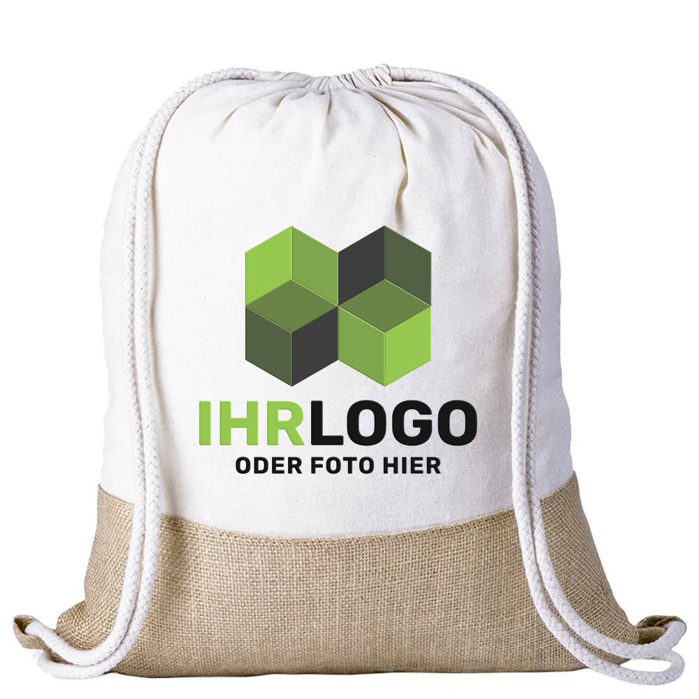 Abmessung: 34 x 43 x cm | Gewicht: 110 gr. | Material: Baumwolle, Jutestoff | Rucksack mit Kordelzug der Linie Nature. Unterteil aus robusten Jutefasern und Oberteil aus Baumwolle (120 g/m2). Mit dicken, geflochtenen Zugbändern und verstärkten Ecken. | Druckfläche: 25 x 25 cm