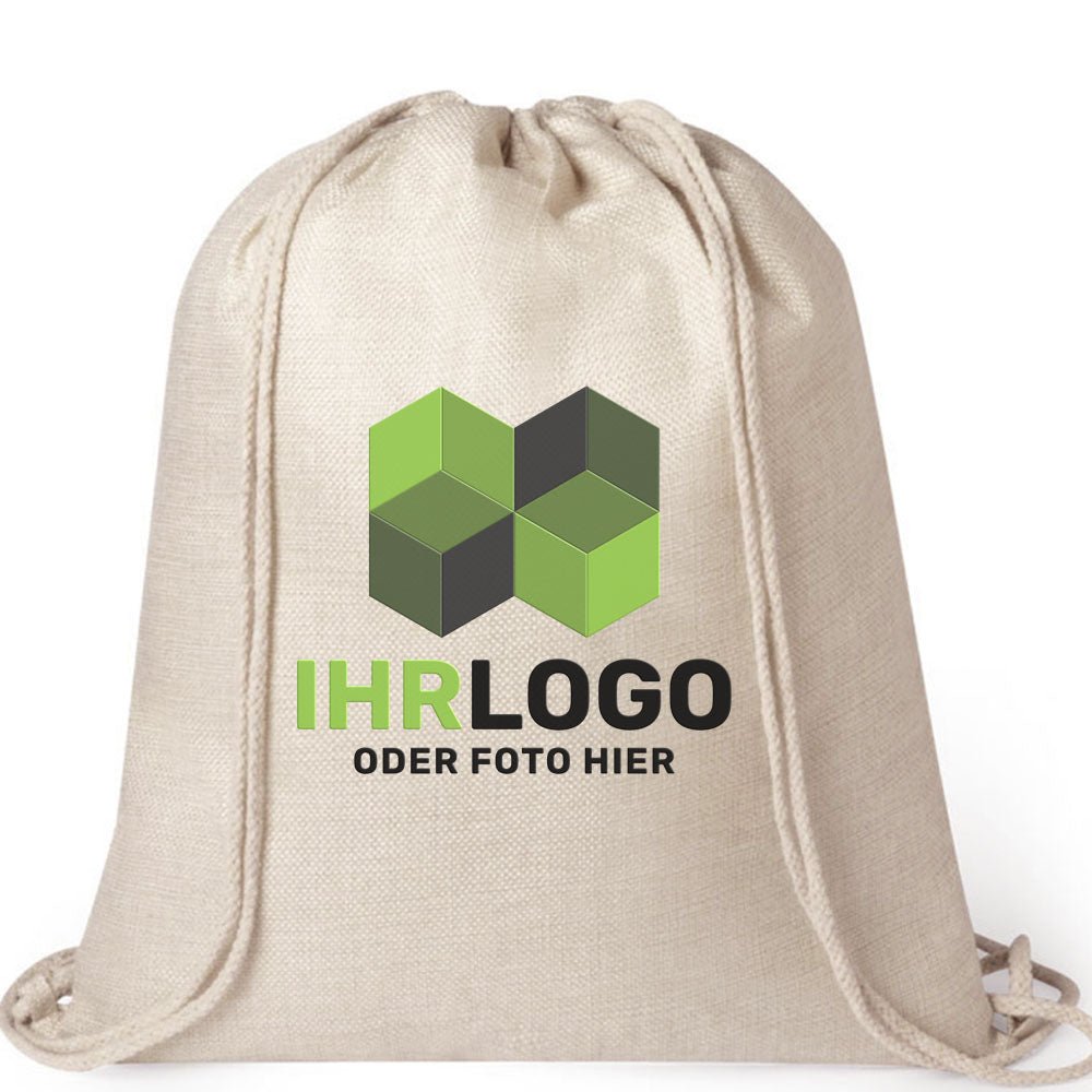Turnbeutel, Sportbeutel in Naturfarbe mit Kordelzug. Die Abmessung liegt bei etwa 34 x 42 cm. Hochwertiges Polyestermaterial speziell für den Digitaldruck hergestellt. Selbstregulierende Schnüre ebenfalls in Naturfarbe. Verstärkte Ecken. Der Beutel hat ein Gewicht von ca. 64 g.