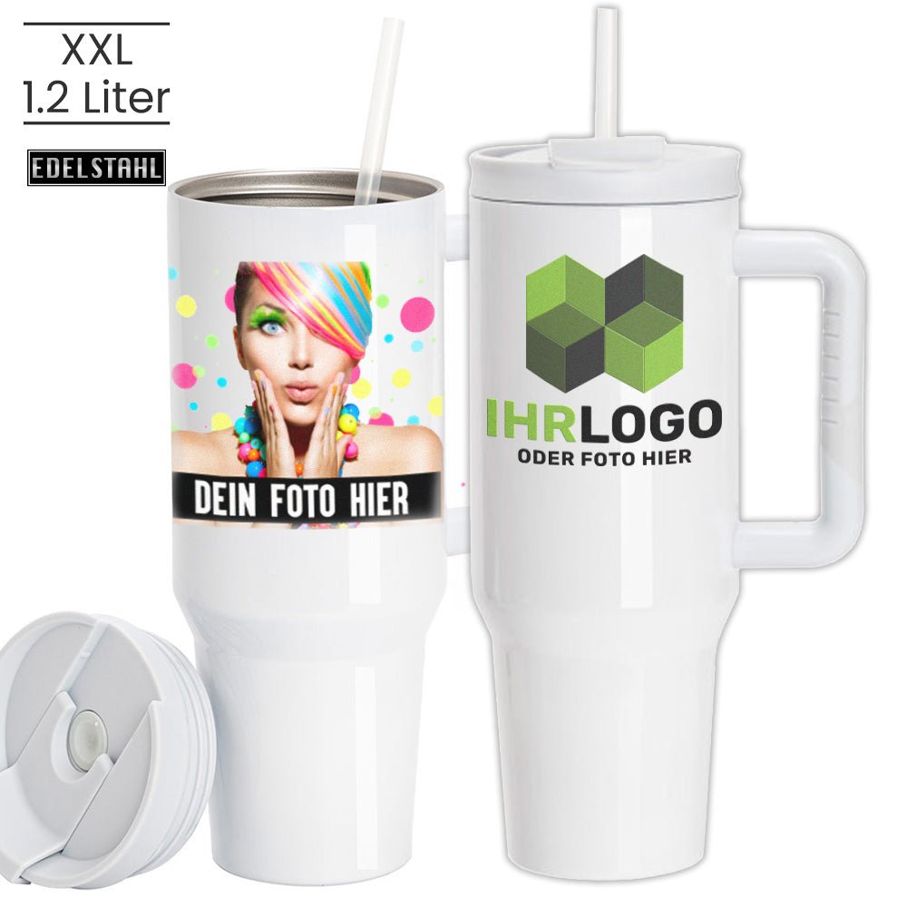 Unser XXL Edelstahl-Thermobecher vereint Funktionalität und Komfort. Mit einem großzügigen Fassungsvermögen von 1,2 Litern bietet er ausreichend Platz für heiße oder kalte Getränke. Die doppelwandige, vakuumisolierte Konstruktion hält die Temperatur langanhaltend konstant. Der praktische Flip-Deckel mit Trinkhalm ermöglicht ein auslaufsicheres Trinken, während der gummierte Kunststoffgriff sicheren Halt garantiert. Ideal für unterwegs und lange Tage.